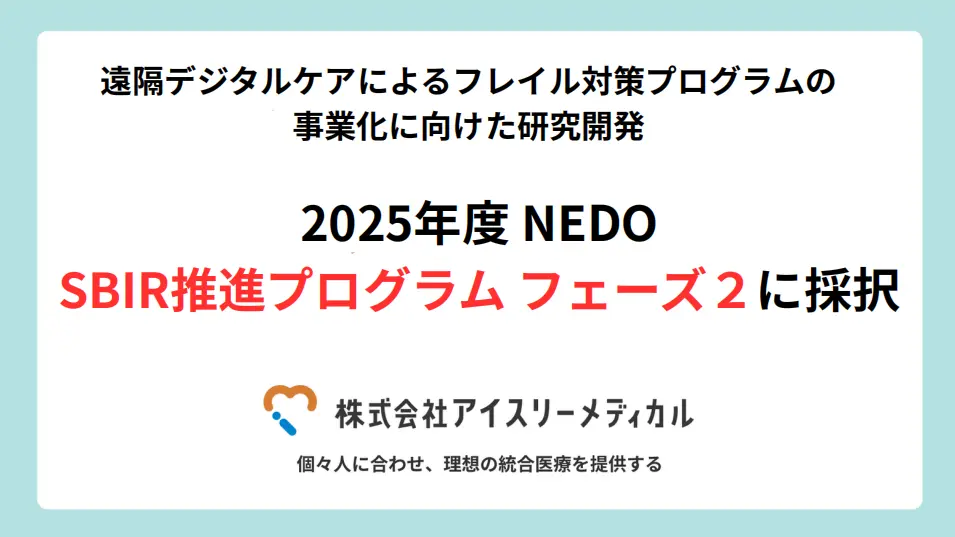 糖尿病予防、デジタルリハビリ、アクティブシニア向け健康増進を実現するデジタル運動療法プラットフォーム「スマリハPRO」を提供する株式会社アイスリーメディカル(本社:東京都中央区、代表取締役社長:久保田明史)は、国立研究開発法人新エネルギー・産業技術総合開発機構(以下「NEDO」)が実施する2025年度「SBIR推進プログラム(一気通貫型)」において、当社事業がフェーズ1を完了し、ステージゲート審査でフェーズ1の結果が評価され、フェーズ2の段階に進んだことをお知らせします。